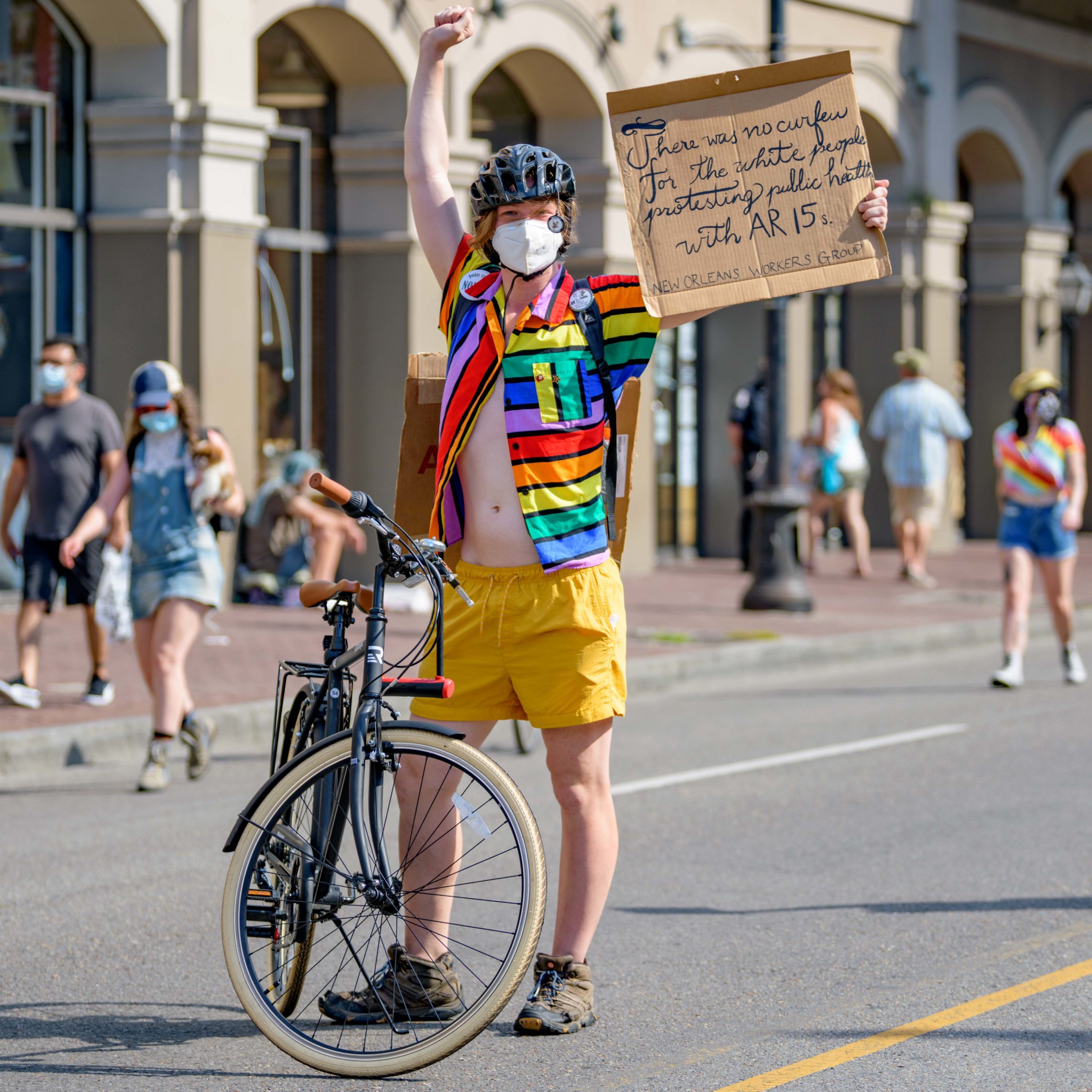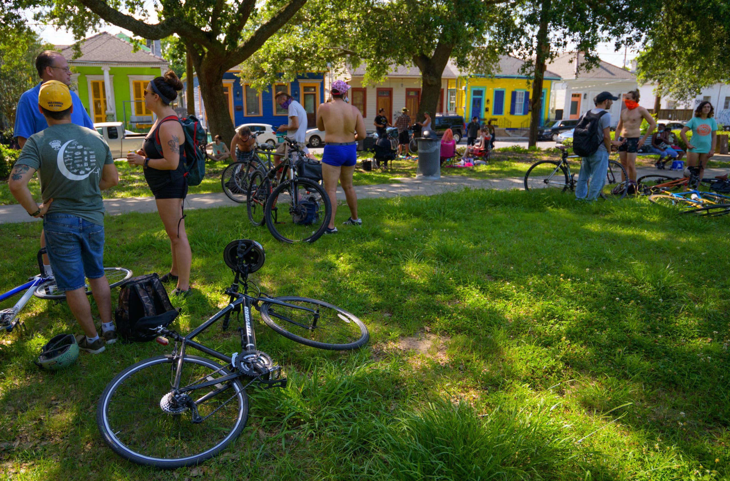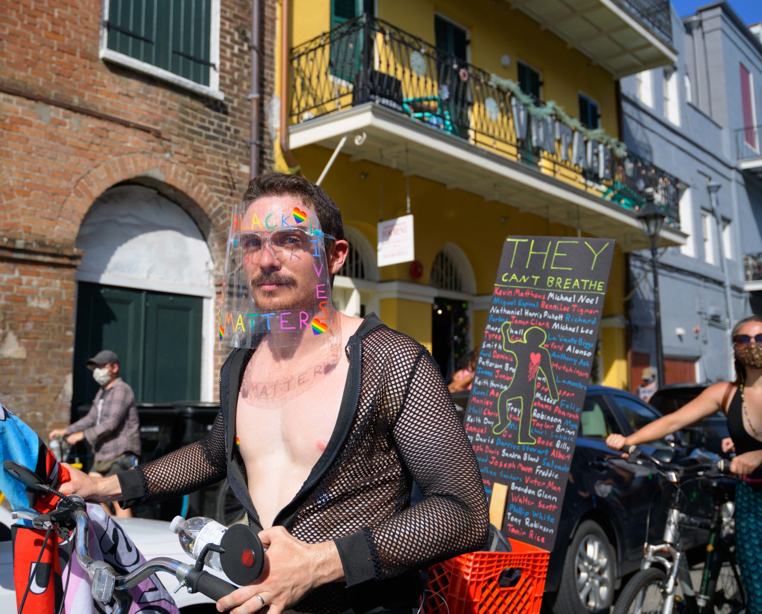 Riders in various stages of undress participate in the 12th annual World Naked Bike Ride New Orleans at Markey Park in the Bywater before continuing on to the French Quarter Saturday, June 13, 2020. The group also passed by a separate group of riders in the French Quarter taking part in the Motorcade for Pride / Rally for LGBTQ Lives. Both rides included LGBTQ+ riders. World Naked Bike Ride NOLA states on its website that the purpose of the ride is to promote a cleaner, safer, body-positive world to the masses in a free, non-sexual, fun bike ride. “Our mission is to take to the streets riding nude as the best way of defending our dignity as humans on bikes. We expose just how vulnerable we are as cyclists on our own city streets. We also ride to protest the world’s oil dependency, mainly cars, that negatively impacts the environment on this planet.” Photo by Matthew Hinton