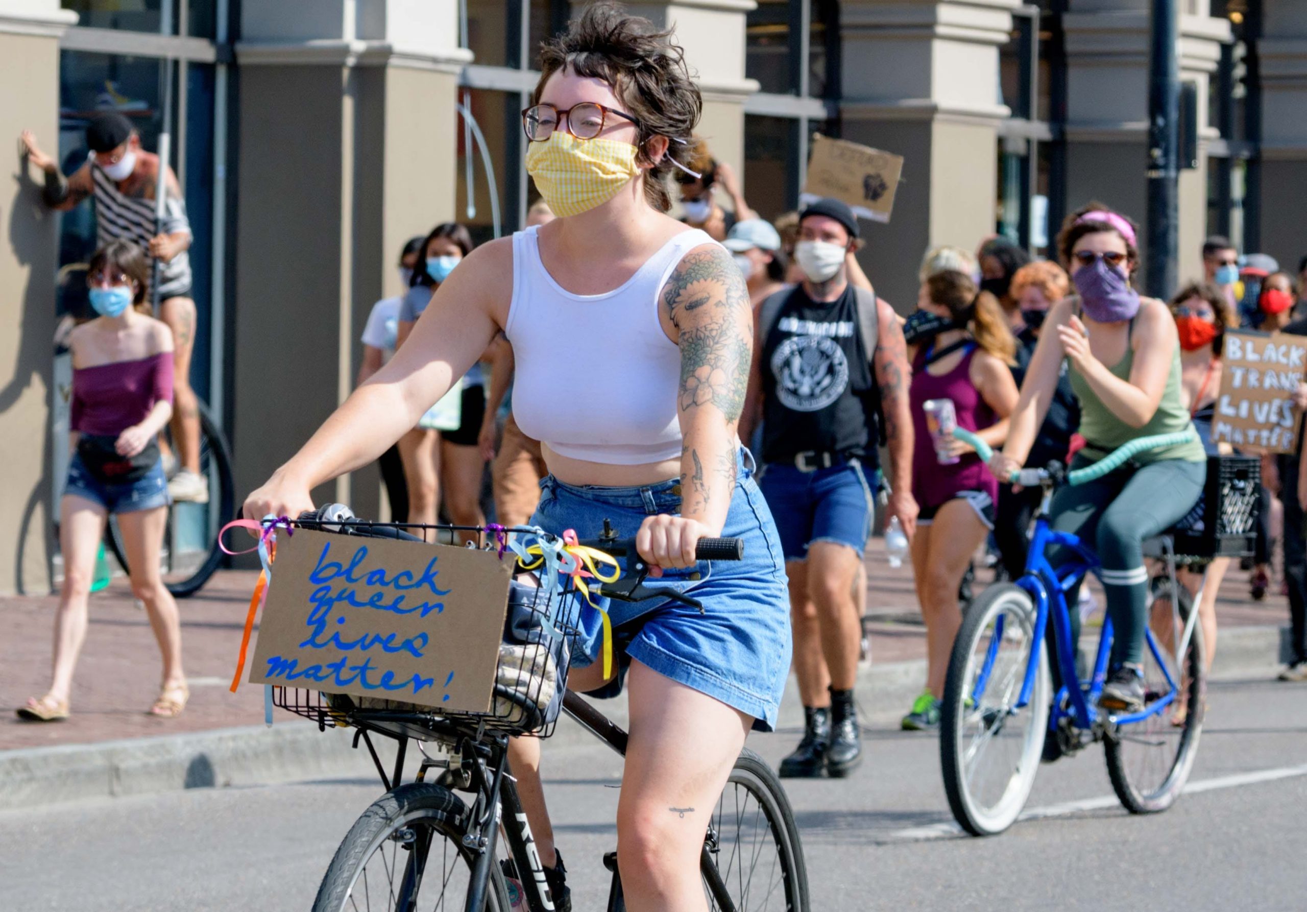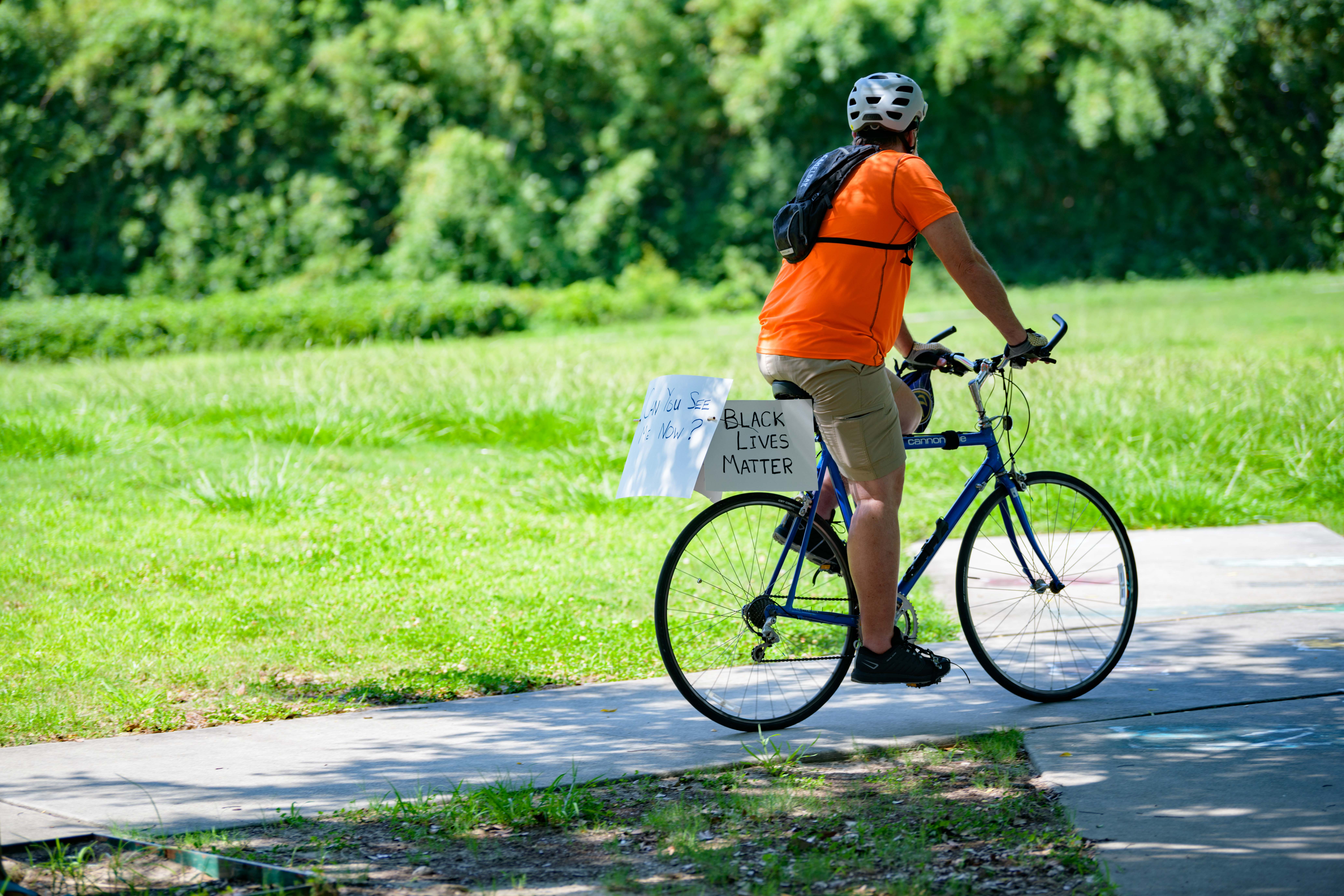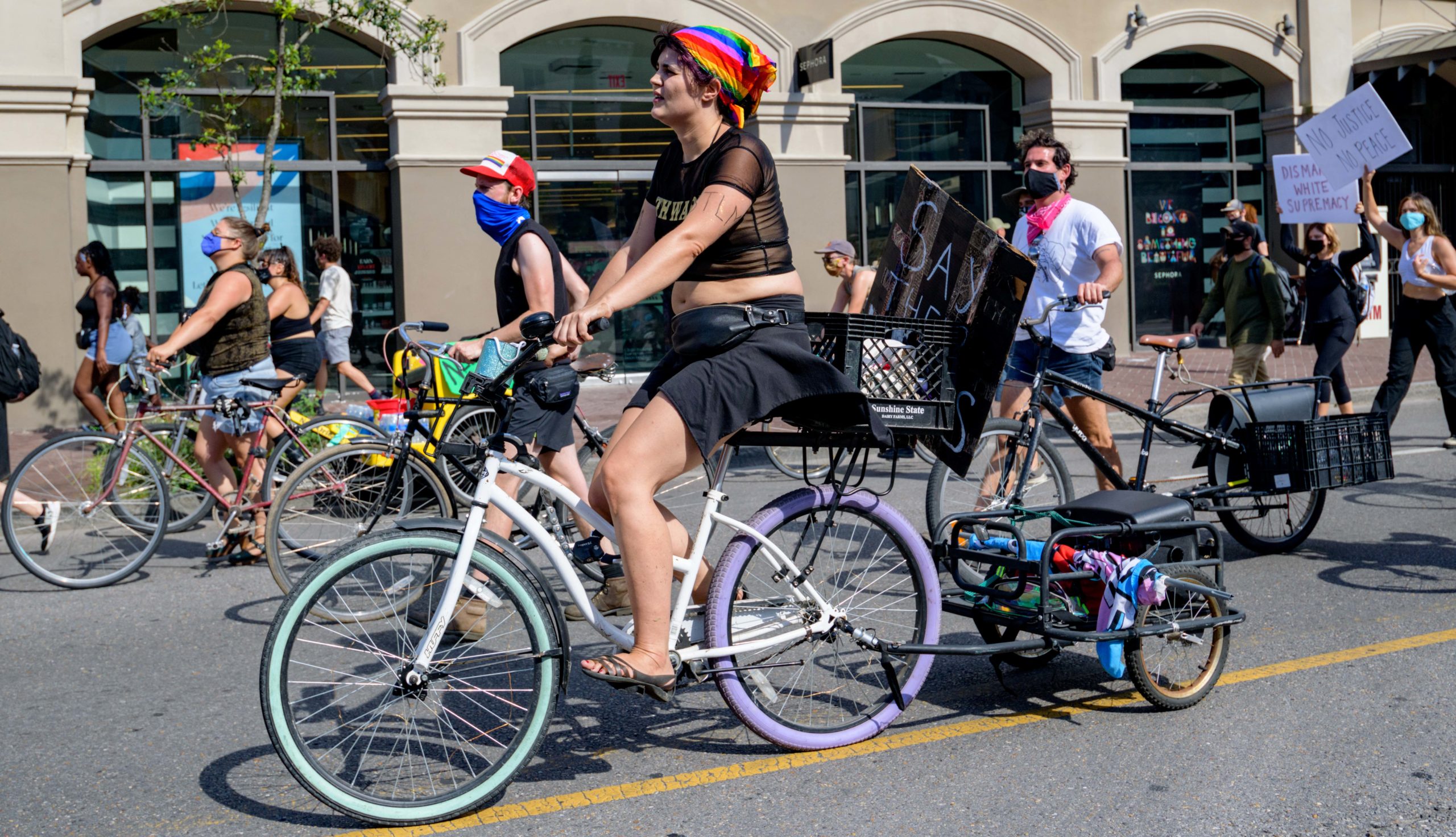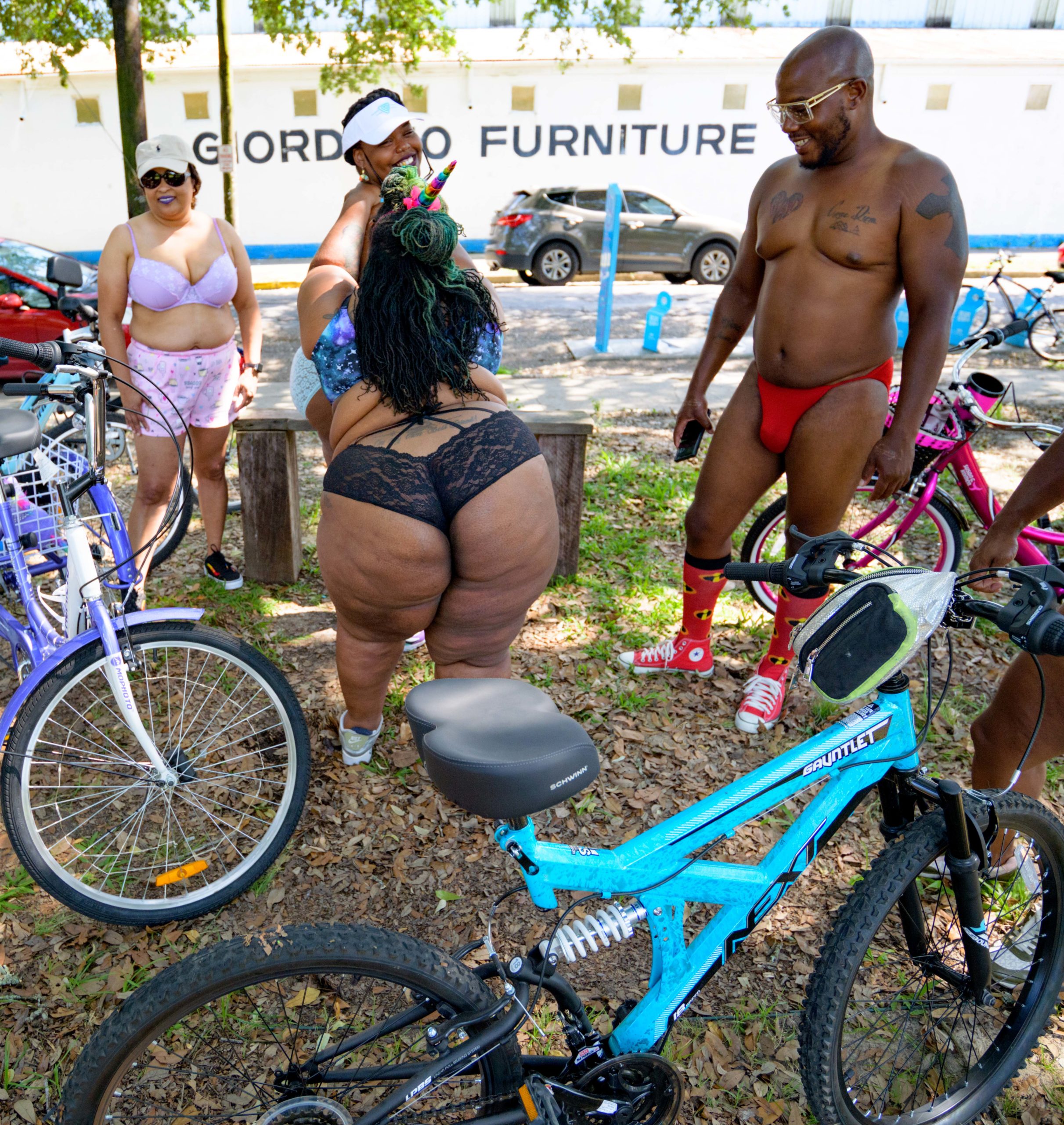 Riders in various stages of undress participate in the 12th annual World Naked Bike Ride New Orleans at Markey Park in the Bywater before continuing on to the French Quarter Saturday, June 13, 2020. The group also passed by a separate group of riders in the French Quarter taking part in the Motorcade for Pride / Rally for LGBTQ Lives. Both rides included LGBTQ+ riders. World Naked Bike Ride NOLA states on its website that the purpose of the ride is to promote a cleaner, safer, body-positive world to the masses in a free, non-sexual, fun bike ride. “Our mission is to take to the streets riding nude as the best way of defending our dignity as humans on bikes. We expose just how vulnerable we are as cyclists on our own city streets. We also ride to protest the world’s oil dependency, mainly cars, that negatively impacts the environment on this planet.” Photo by Matthew Hinton