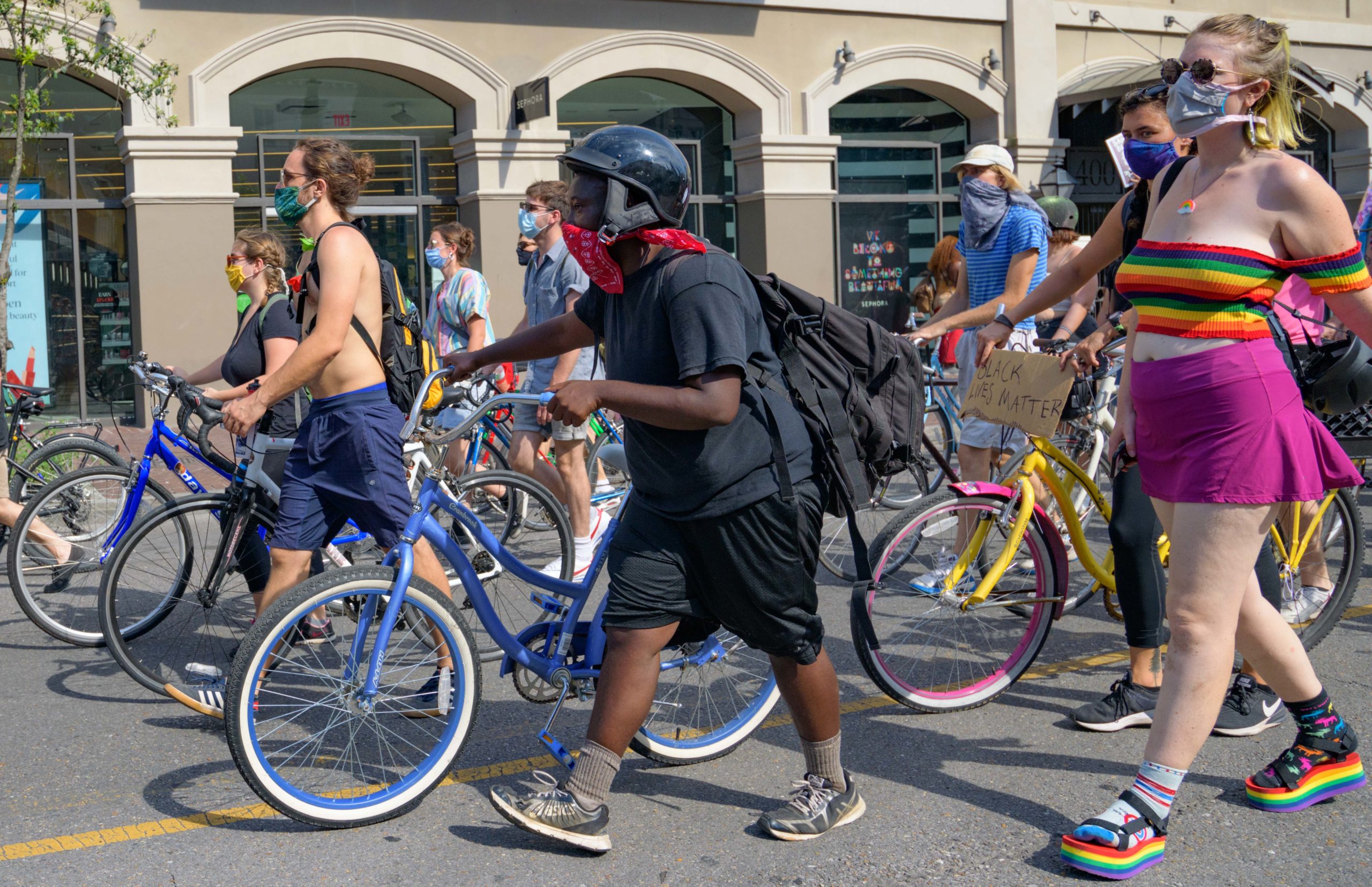 Riders in various stages of undress participate in the 12th annual World Naked Bike Ride New Orleans at Markey Park in the Bywater before continuing on to the French Quarter Saturday, June 13, 2020. The group also passed by a separate group of riders in the French Quarter taking part in the Motorcade for Pride / Rally for LGBTQ Lives. Both rides included LGBTQ+ riders. World Naked Bike Ride NOLA states on its website that the purpose of the ride is to promote a cleaner, safer, body-positive world to the masses in a free, non-sexual, fun bike ride. Our mission is to take to the streets riding nude as the best way of defending our dignity as humans on bikes. We expose just how vulnerable we are as cyclists on our own city streets. We also ride to protest the world’s oil dependency, mainly cars, that negatively impacts the environment on this planet. Photo by Matthew Hinton