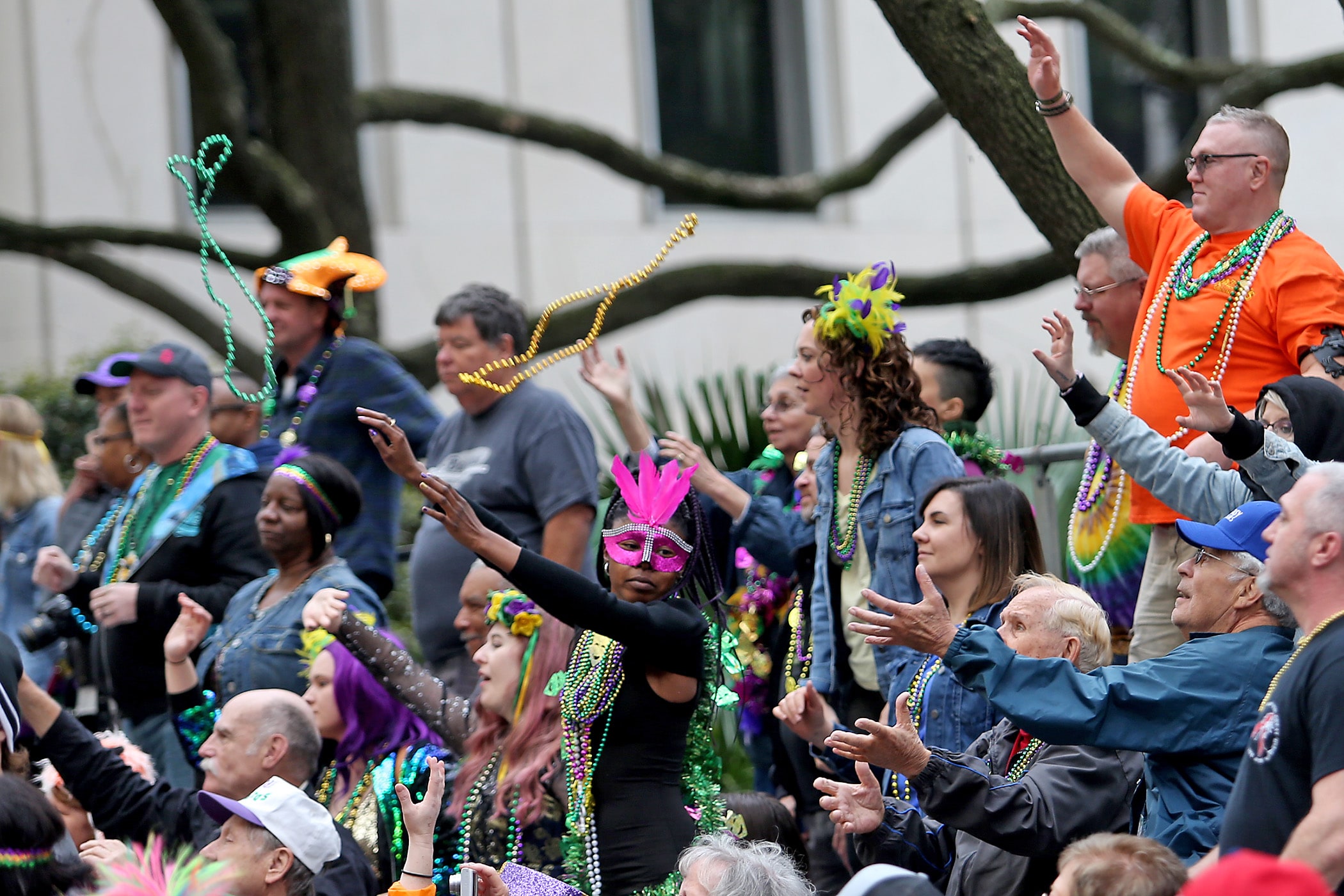 Saints and Pelicans owner Gayle Benson scores a coconut as the 1,500 members of the Zulu, led by their King Brian M. Sims and Queen Dr. Chanda Macias, roll up St. Charles Avenue with their parade entitled “Zulu’s Book of Love and Cinema” on Mardi Gras Day, 2020. (Photo by Michael DeMocker)