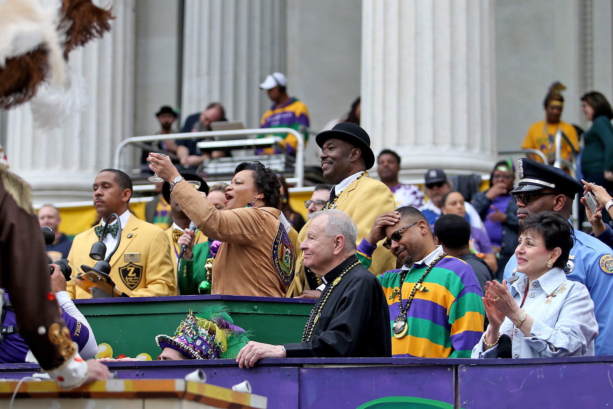 The King is toasted at the reviewing stand at Gallier Hall as the 1,500 members of the Zulu, led by their King Brian M. Sims and Queen Dr. Chanda Macias, roll up St. Charles Avenue with their parade entitled “Zulu’s Book of Love and Cinema” on Mardi Gras Day, 2020. (Photo by Michael DeMocker)