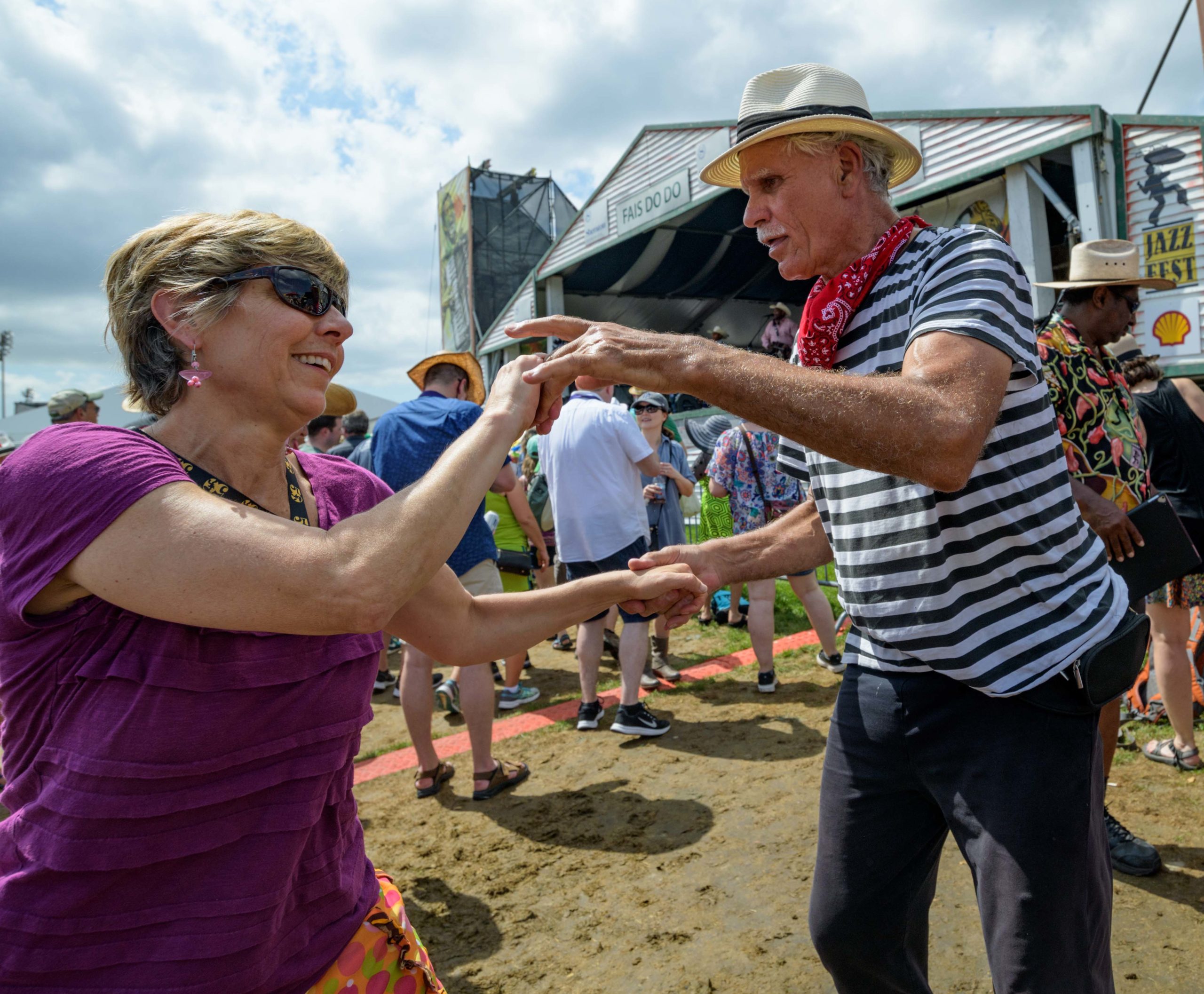 People dance at the Fais Do Do stage at the Fair Grounds during the New Orleans Jazz and Heritage Festival or Jazz Fest in New Orleans, La. Thursday, May 2, 2019. Photo by Matthew Hinton