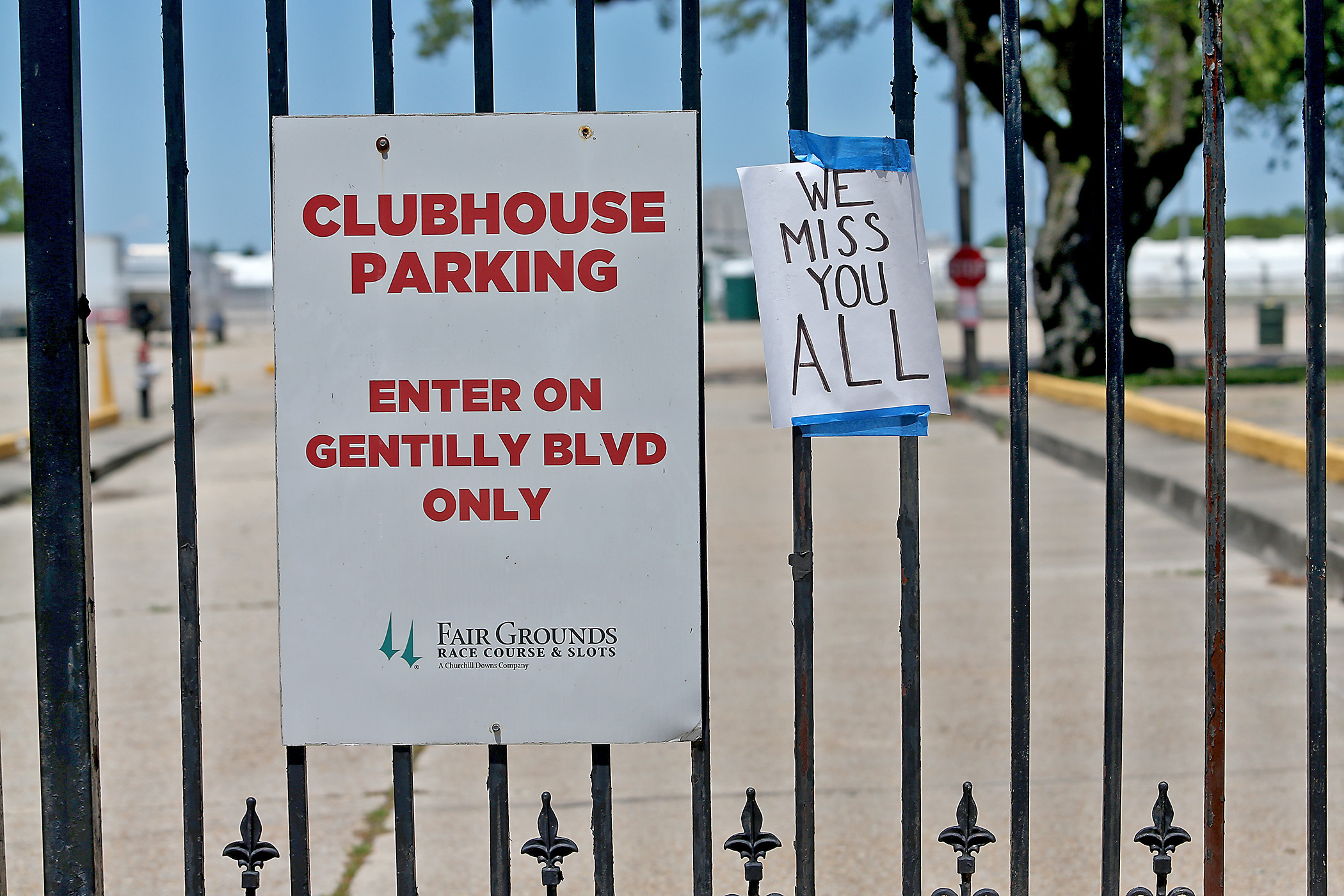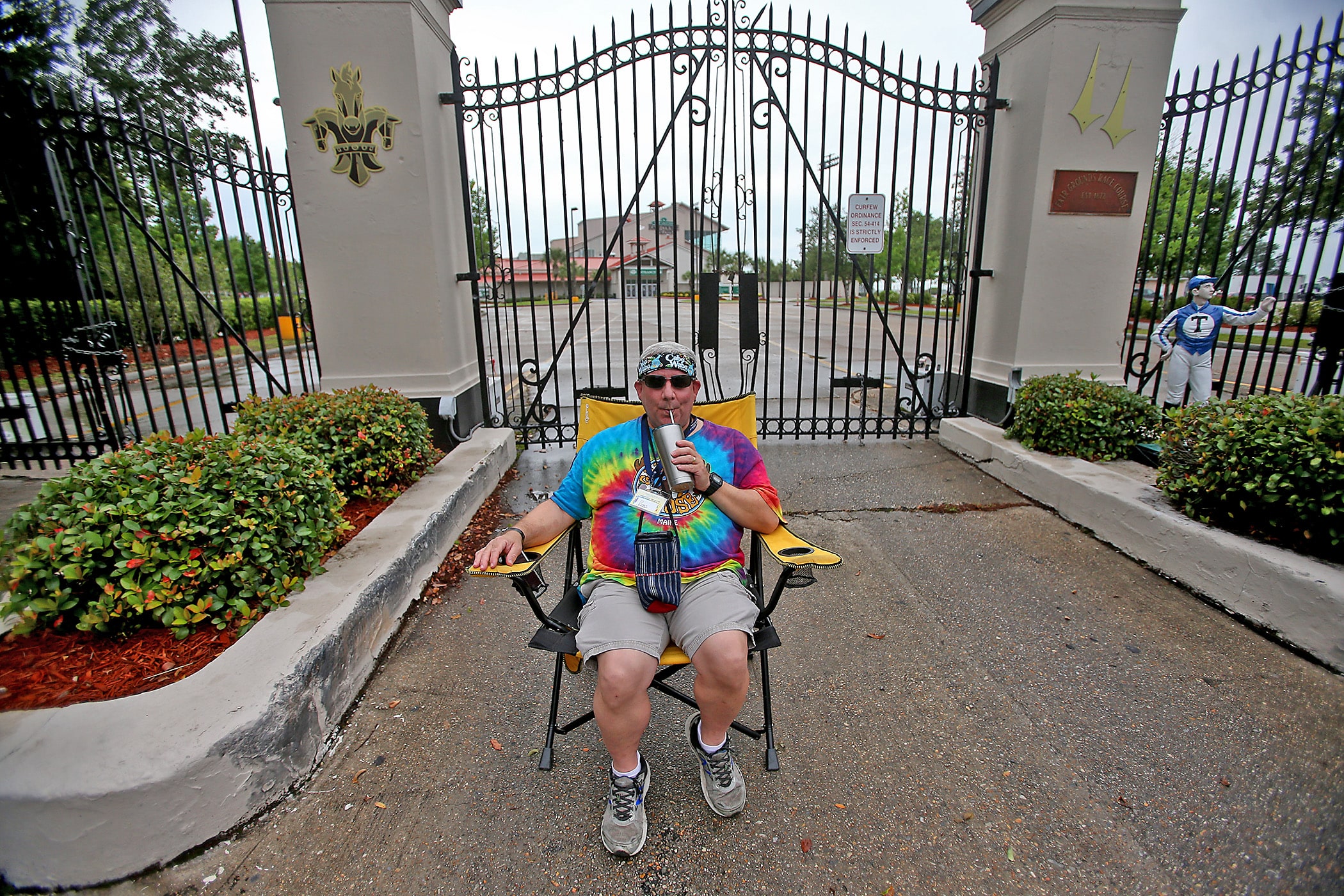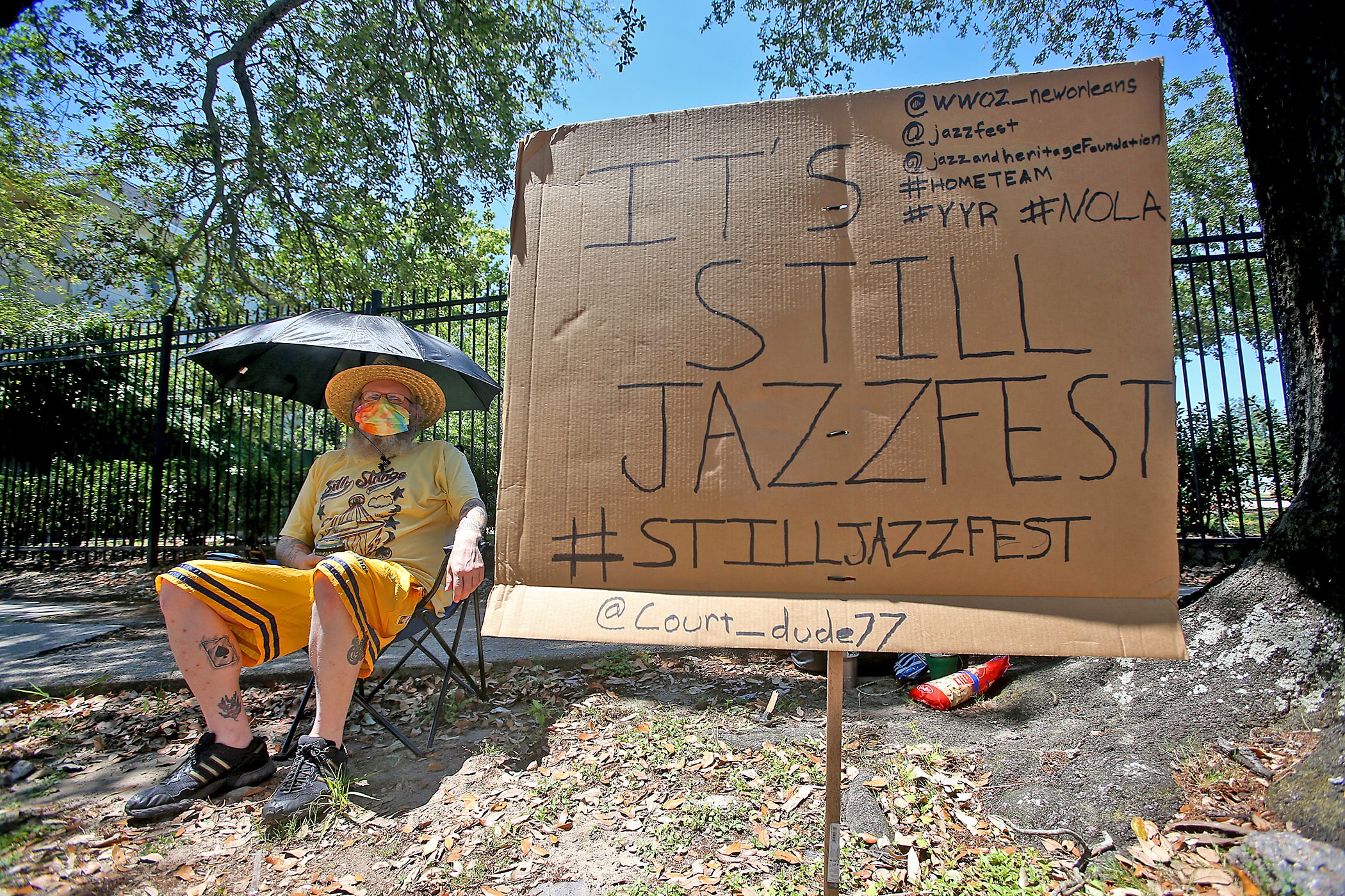 Courtney McColloch is determined the show must go on as he listens to the WWOZ broadcast outside the shuttered gates of the Fair Grounds after the 2020 New Orleans Jazz & Heritage Festival was cancelled by the Covid-19 pandemic. Photographed on Friday, April 24, 2020. (Photo by Michael DeMocker)