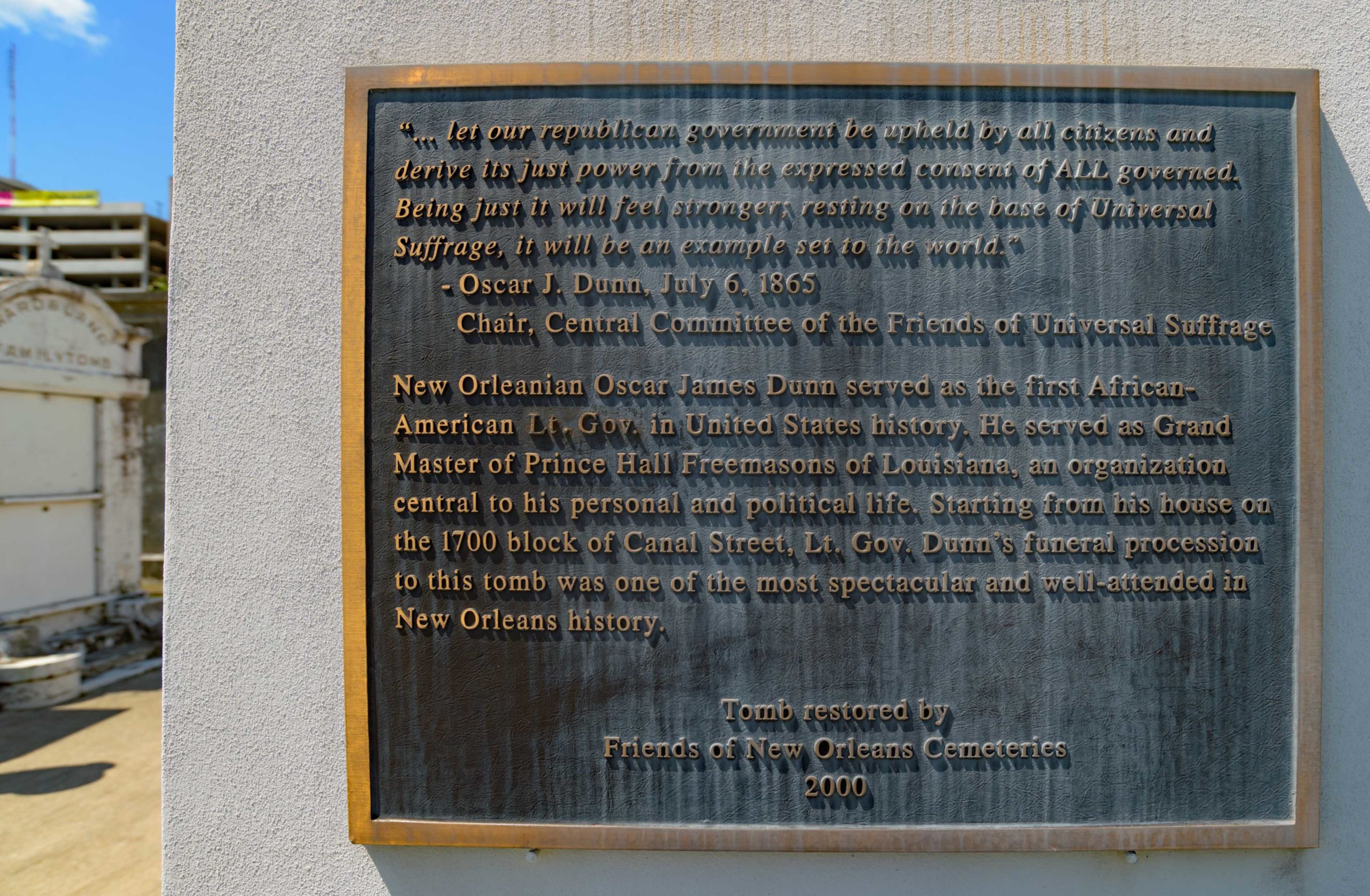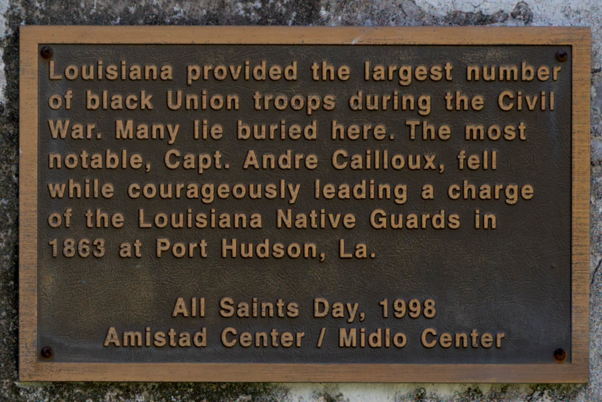 A small triangular park by the former St. Rose de Lima Church on Bayou Road was recently renamed after Cailloux on maps, however, there is no plaque or monument displaying his name there. A small plaque was put up in 1998 inside St. Louis Cemetery No. 2 where he is buried. In 1874, the Grand Army of the Republic, a society of Union veterans of the Civil War, erected perhaps the only substantial monument to Union soldiers in the Greater New Orleans area at Chalmette National Cemetery. Over 100 Louisiana Native Guard soldiers, who were later reorganized as the 73rd Infantry Regiment United States Colored Troops (U.S.C.T), are also buried there. The Latin inscription on the monument reads “Dum Tacent Clamant” meaning “While they are silent, they cry aloud.”