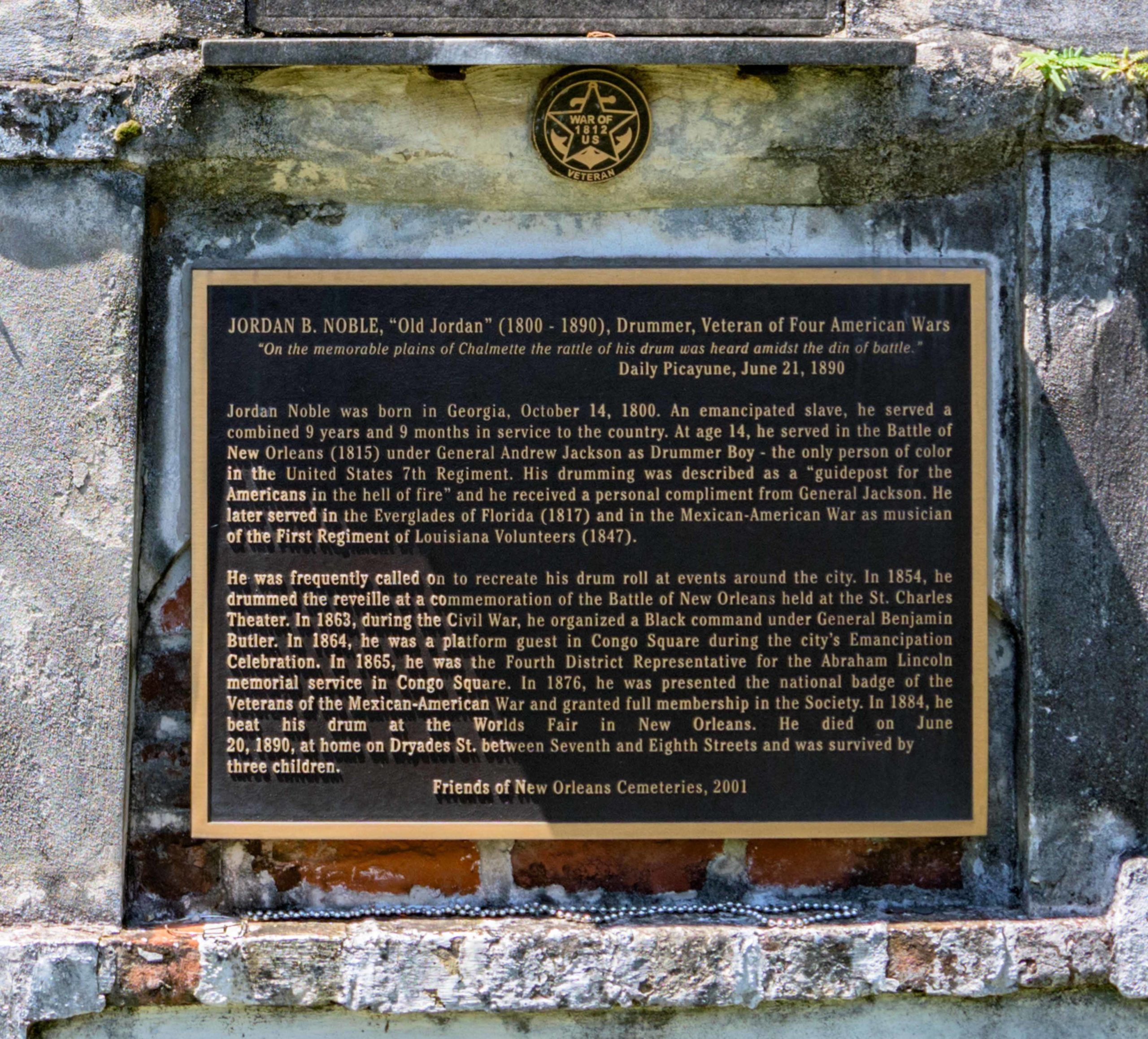 A modern brass band at present day second line parade has instruments that face front, like the Sousaphone tuba invented in 1893, and bands usually form in the middle or back of a procession. Though valve brass instruments were invented in the early and mid-1800s, music including singing and percussion at a “homegoing” had been around since the arrival of Black Africans in New Orleans. A “homegoing” is oftentimes a jubilant celebration of the freedom after death, but it also includes expressions of mourning. The homegoing tradition began when African enslaved people blended their funeral and death rites with the Christianity they were exposed to in America. These celebrations predate jazz music and the term “jazz funeral,” but the two terms have a similar meaning with the celebration incorporating upbeat New Orleans music including jazz, and mournful funeral dirges. Jordan F. Noble, the drummer boy of Chalmette, played at age 14 for General Andrew Jackson during the Battle of New Orleans in 1815 as the only Black member of the 7th Infantry Regiment. After his time in the military, Noble was called upon to drum at functions and funerals while accompanied by a band throughout the 1800s.