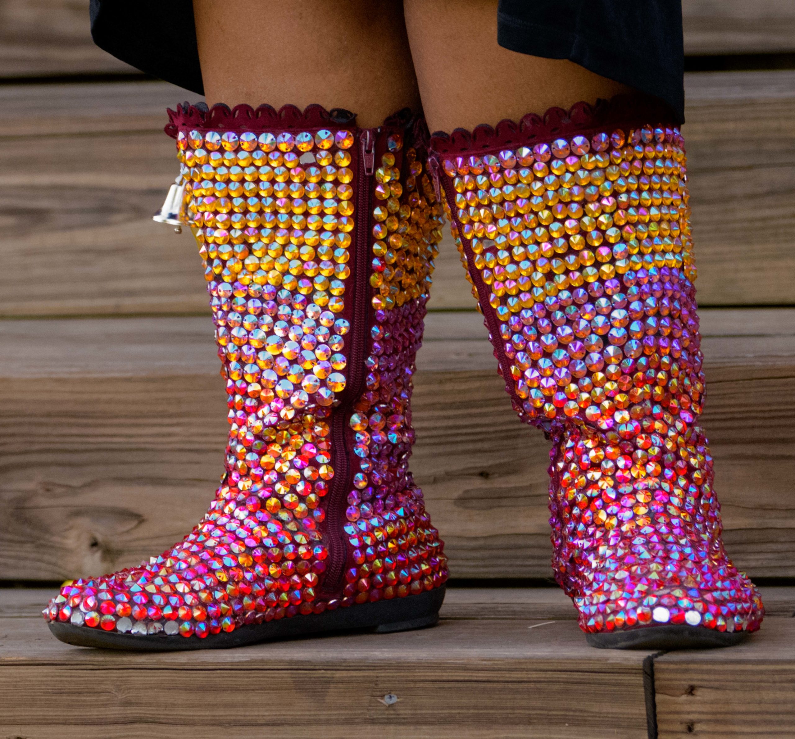 Photojournalist Kerry Maloney wears white majorette boots with giant green tassels and a shiny chrome flapper dress topped with pink-colored hair and a soldier’s hat with a big yellow ostrich feather. Dancing ten feet away is Jessica Fender wearing a blue and clownfish sequined blouse with black and white striped pants and a big white bow with black polka dots in her bright orange hair. Maloney’s tan-colored dog, Dorothy looks, amused through the front window after she was painted with glamourous-looking black eyebrows for a dog drag show.