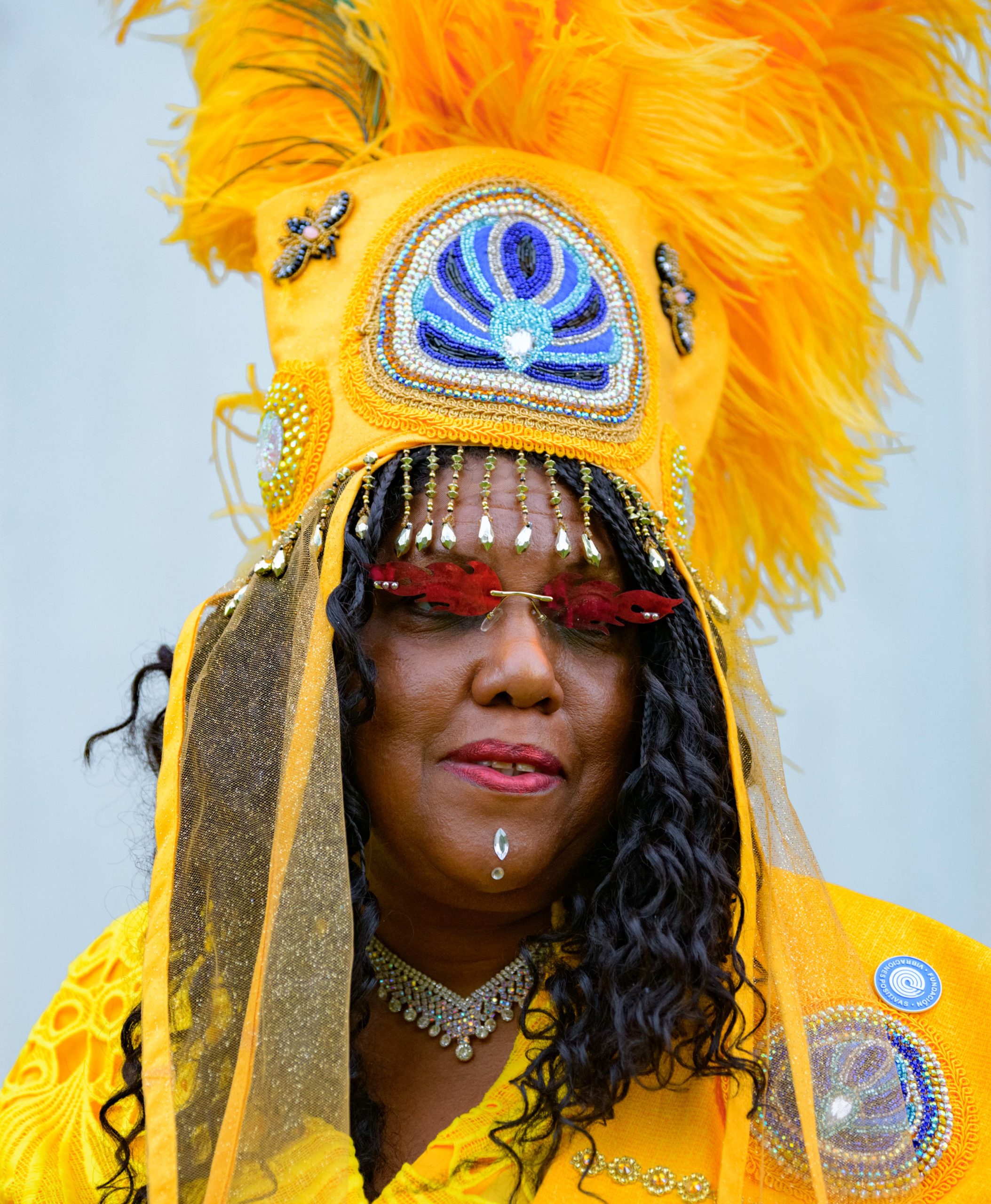 Dressed in yellow with a feathered hat and a beaded sash, she pours libations and lists names of ancestors including other Big Chiefs and Big Queens, eventually going all the way back to an ancestor named Madison, who was stolen and enslaved at age 11.