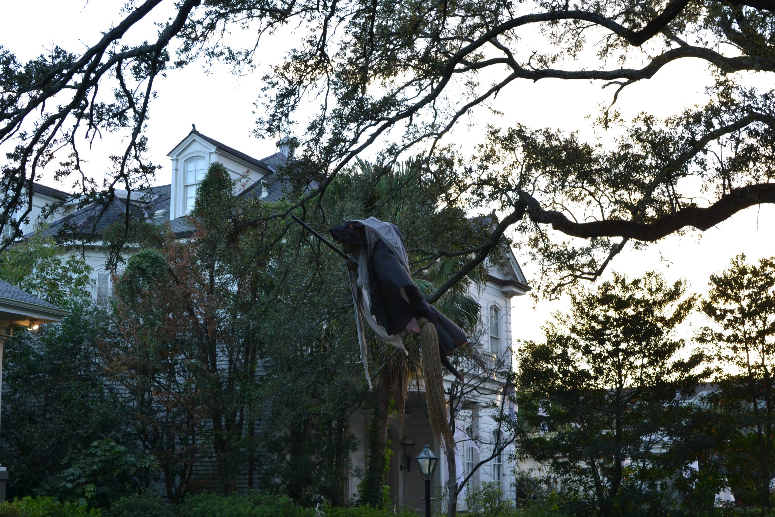 From Ghost Manor, make your way to Saint Charles Avenue and drive Uptown. You will see a number of elaborately decorated houses including one with a lifelike witch flying on her broomstick among the majestic live oaks.