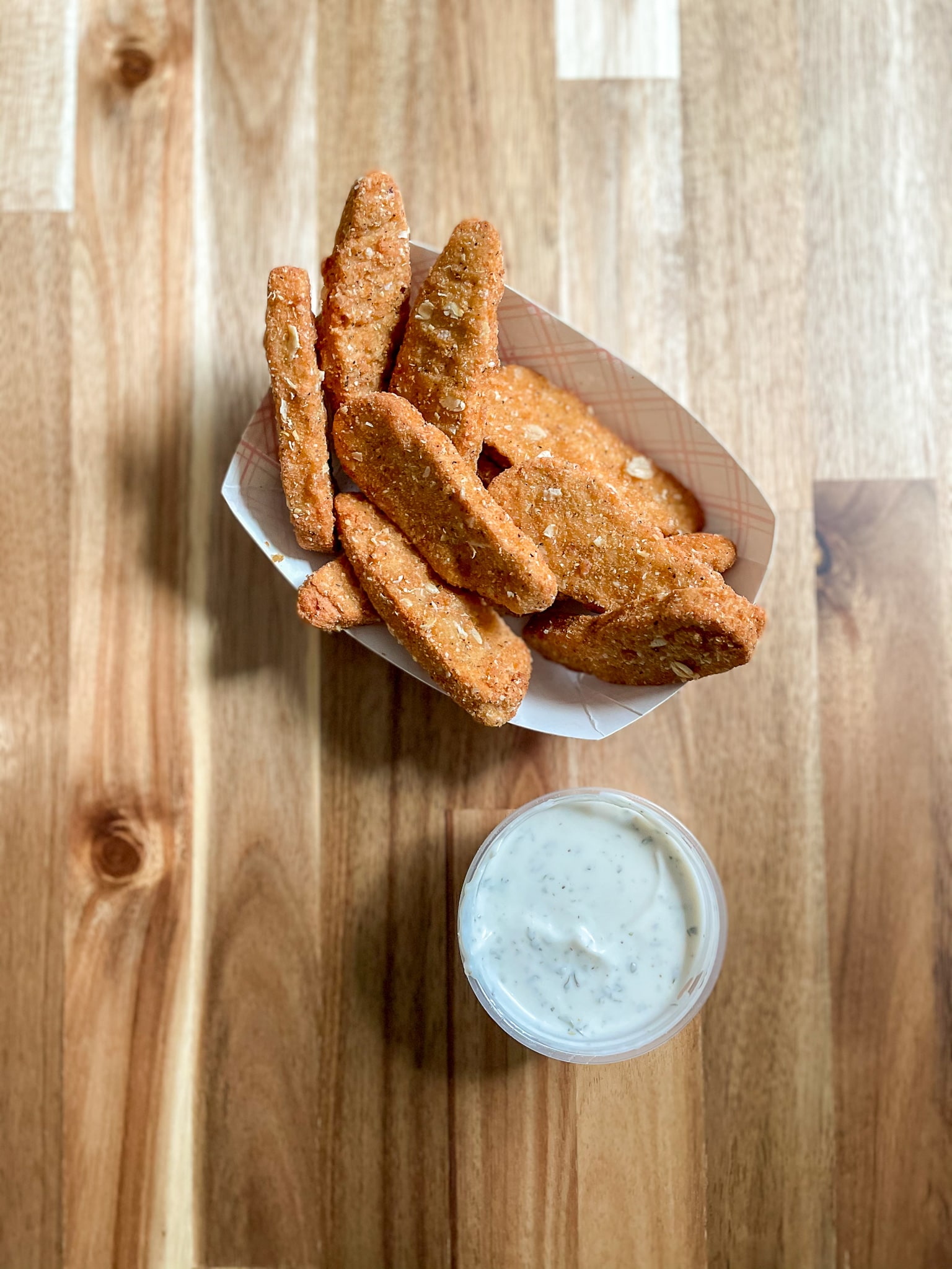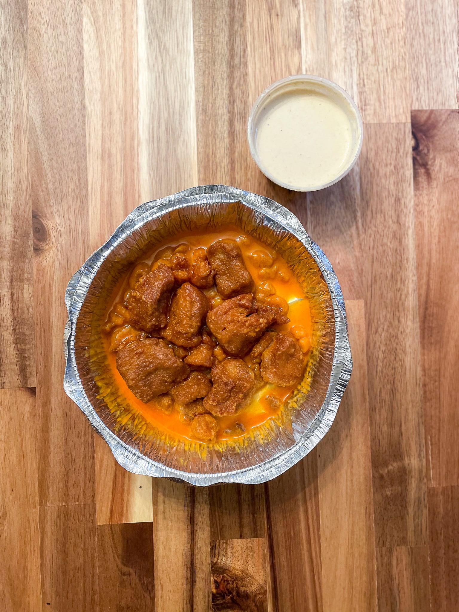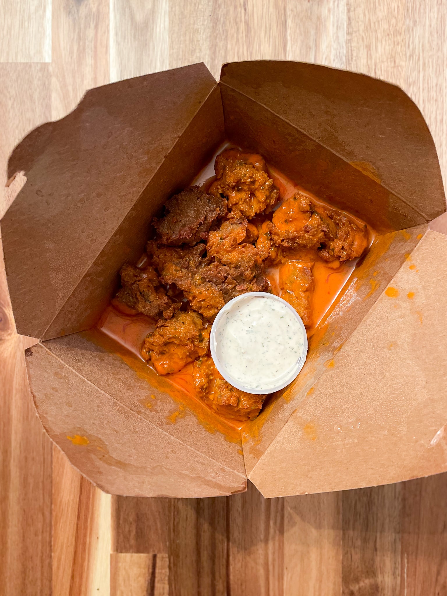 They came with a vegan ranch that’s super thick and creamy. That said, it’s very dill-forward, more so than a traditional ranch, but the mixture of it and the wings got an A+ from both my boyfriend and me.