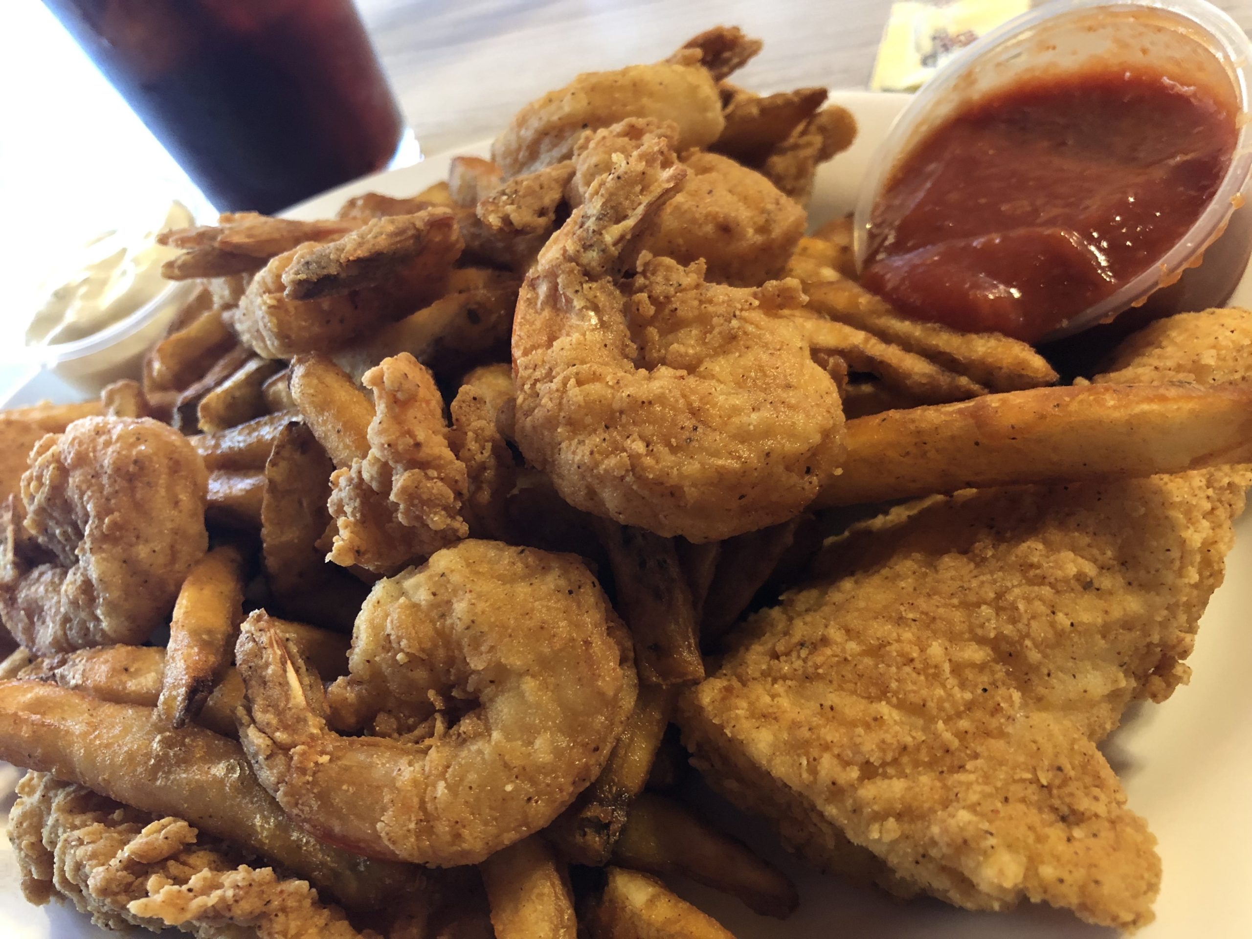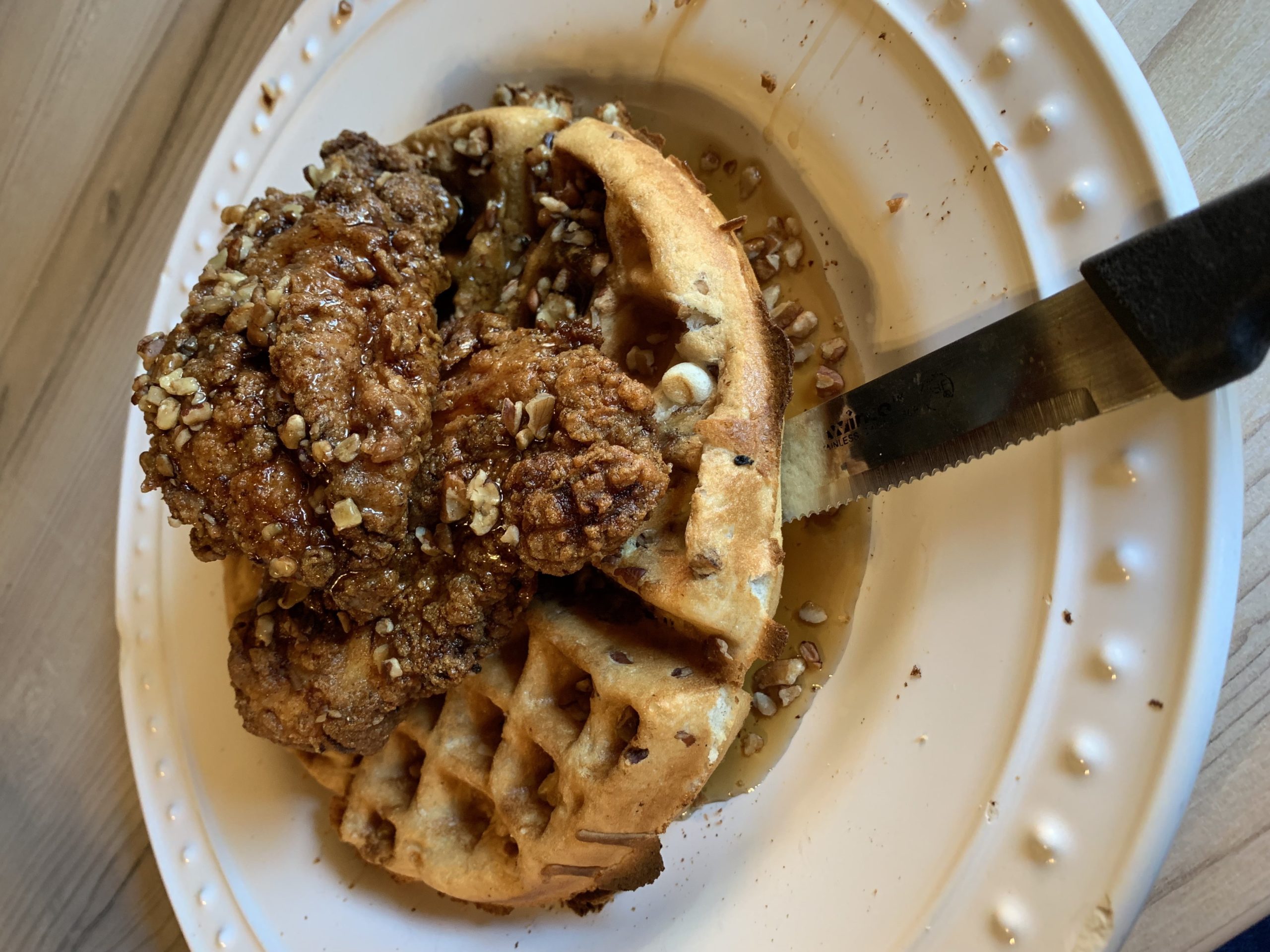 Our table had the fried shrimp and catfish combo plate, the grilled pork chops and the chicken and waffles. Hands down, the winner at the table was the chicken and waffles. The chicken was seasoned well, and the waffle wasn’t bad. The fried shrimp and catfish were OK. The batter was a little on the bland side, honestly.