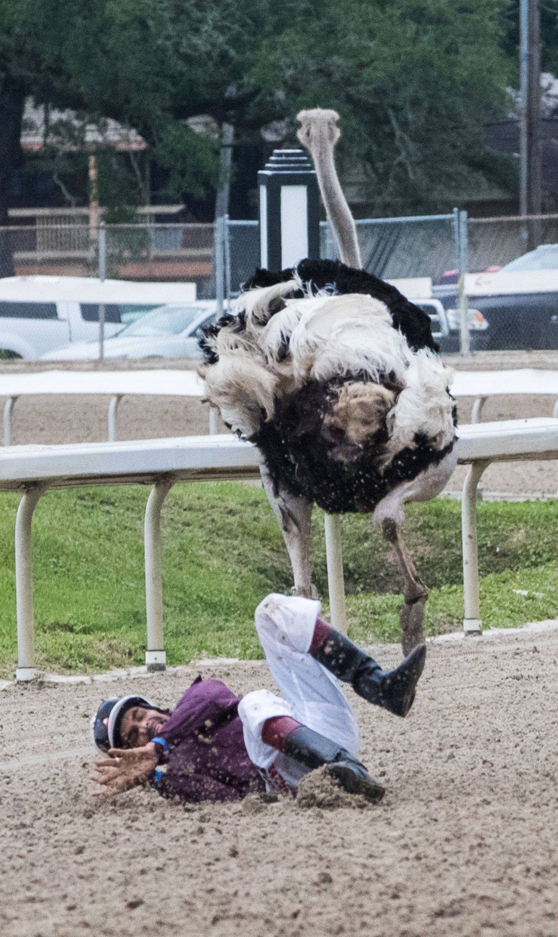 I know, you thought we were kidding. Check out this video of the ostriches racing. It’s everything you wanted, including one of the jockeys taking a small tumble.